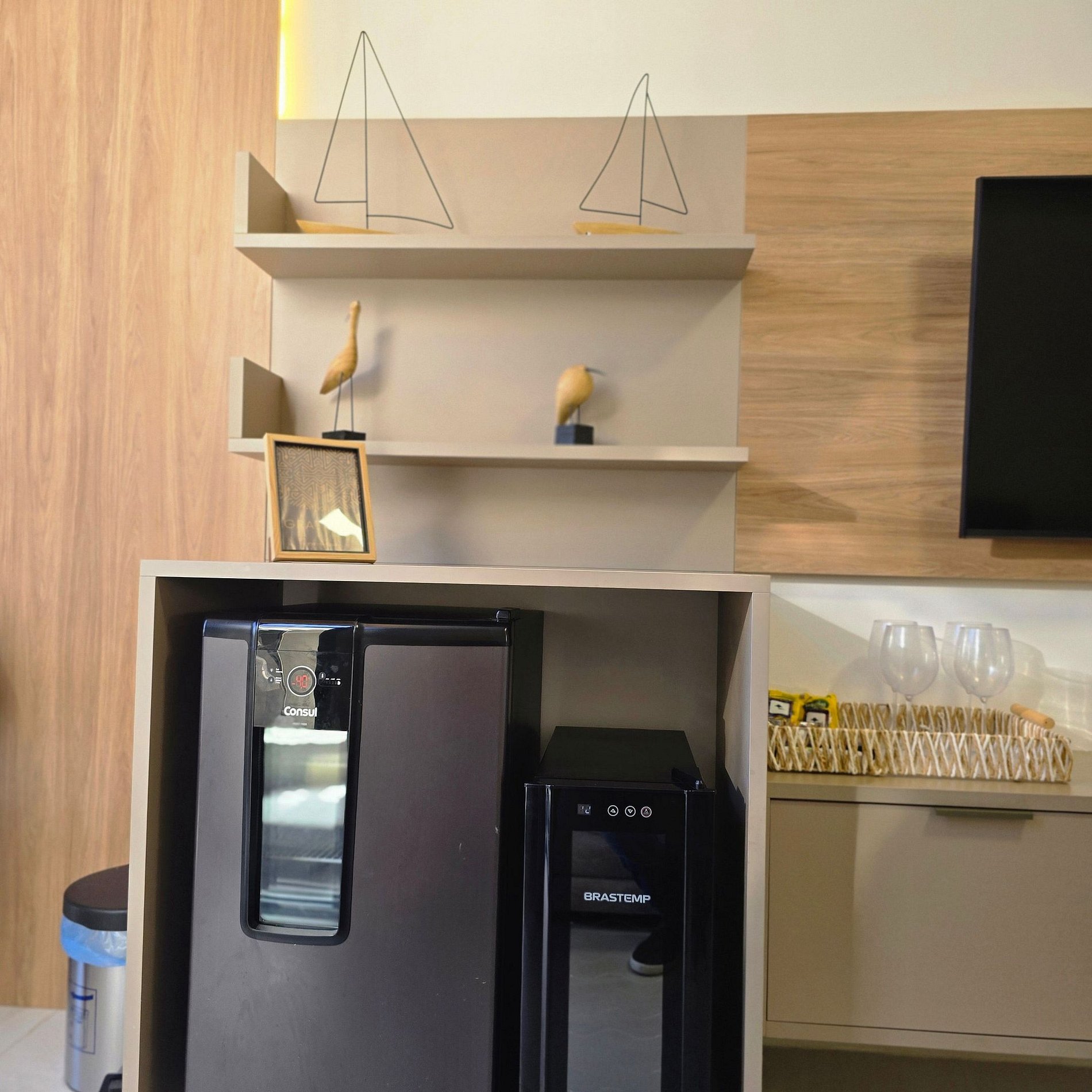 Sala: sofá cama, adega, cervejeira, TV e ar-condicionado