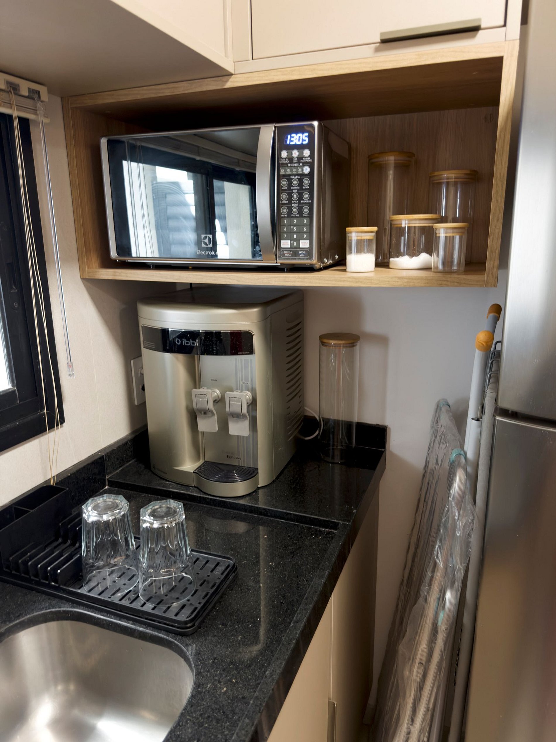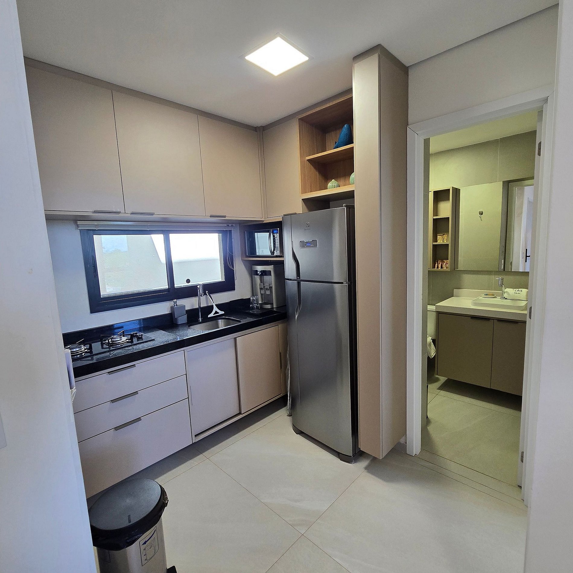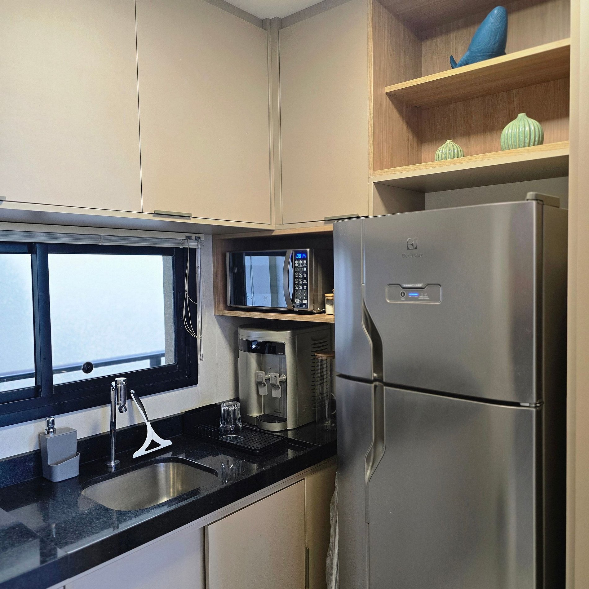 Cozinha completa: geladeira, micro-ondas, cooktop e utensílios