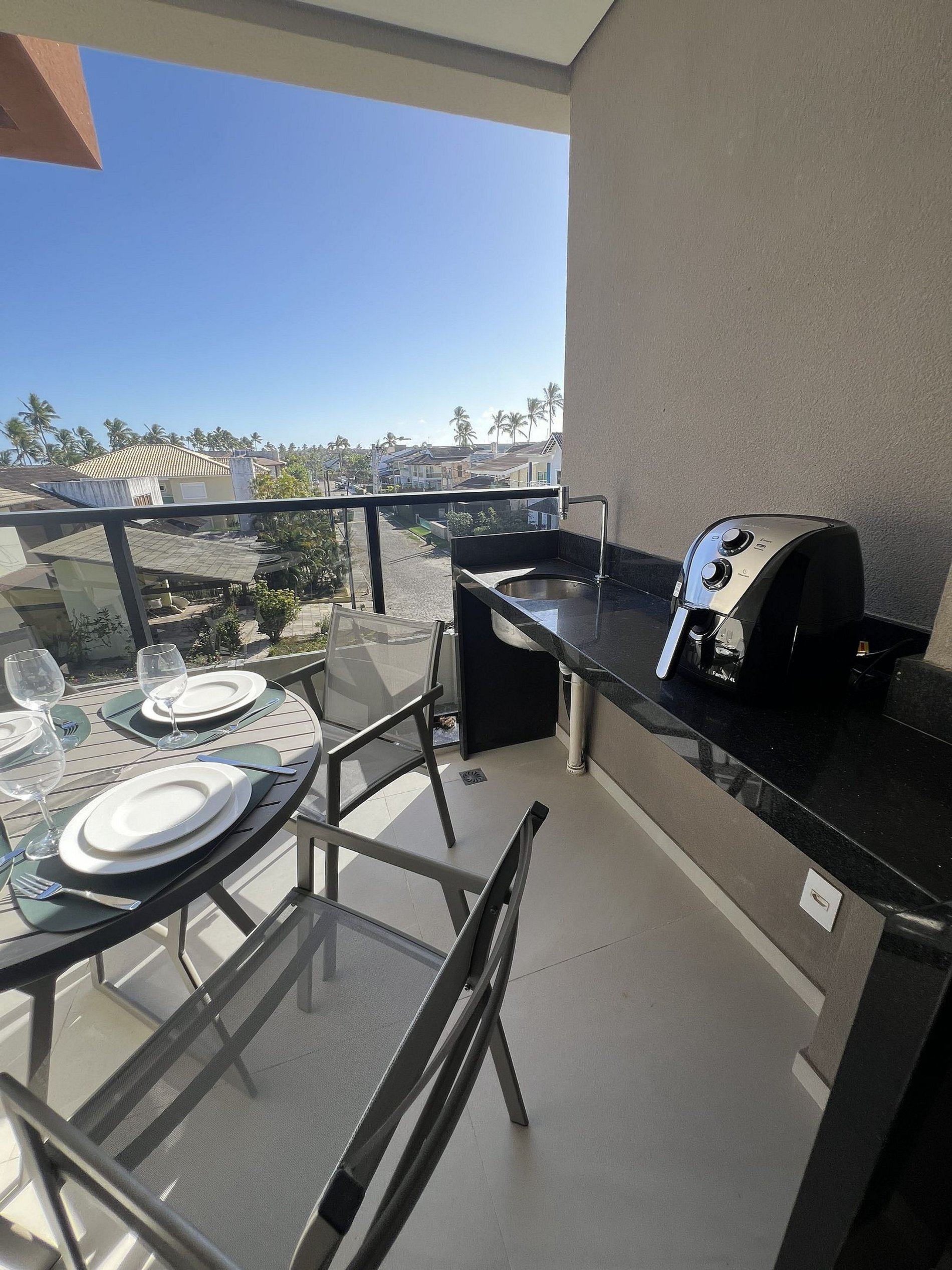 Gourmet balcony with partial sea and pool view; indoor electric grill;