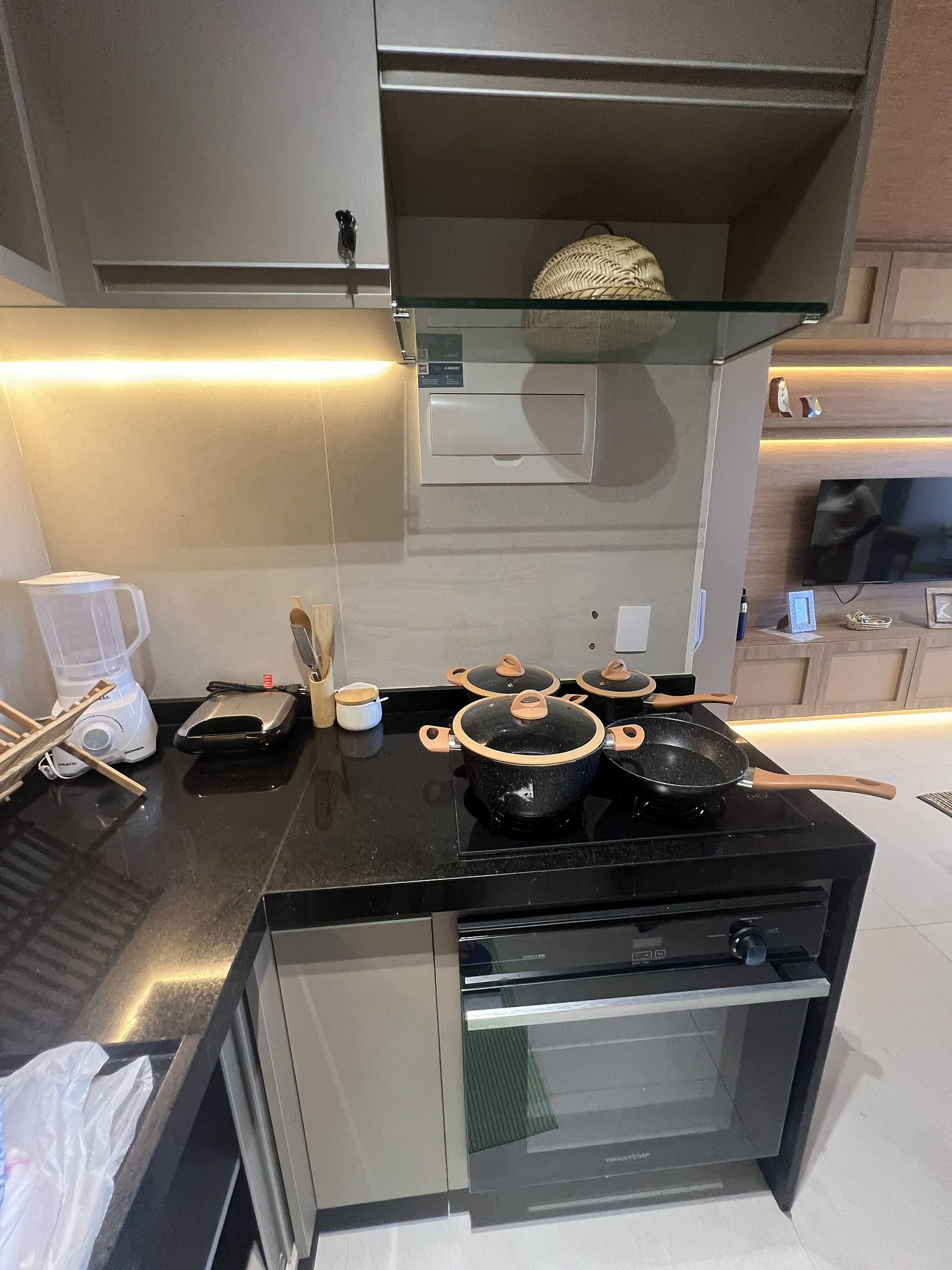 Gourmet balcony with partial sea and pool view; indoor electric grill;