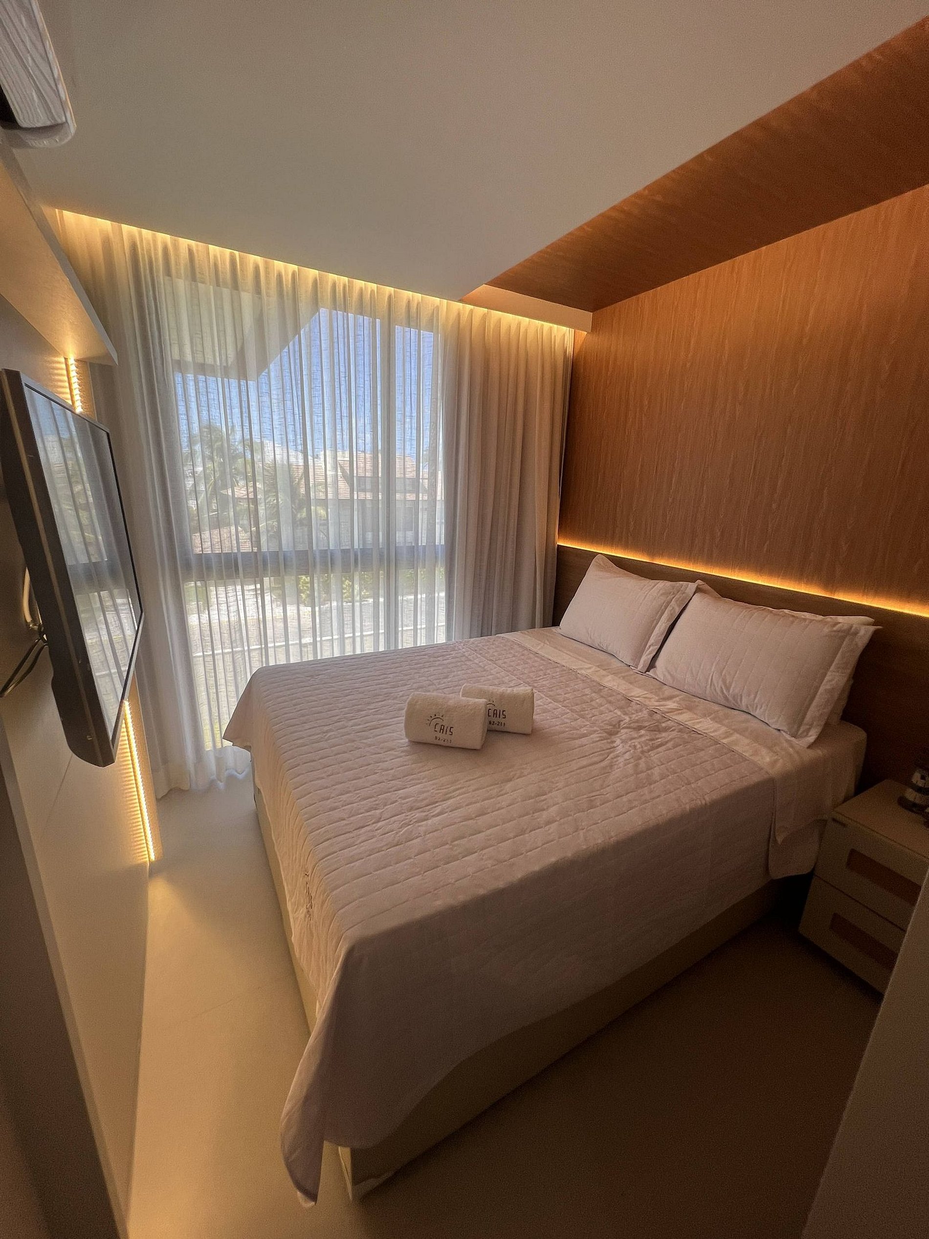 Bedroom with partial sea view, queen bed, wardrobe, TV, and air conditioning;