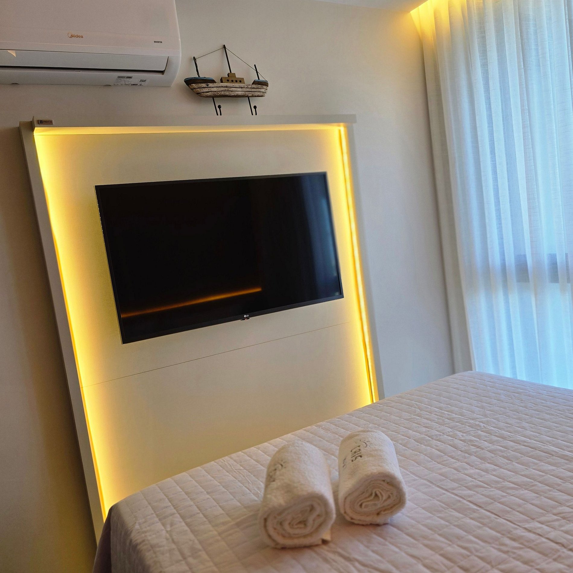 Living room convertible into a bedroom, with queen sofa bed, wardrobe, TV, and air conditioning;