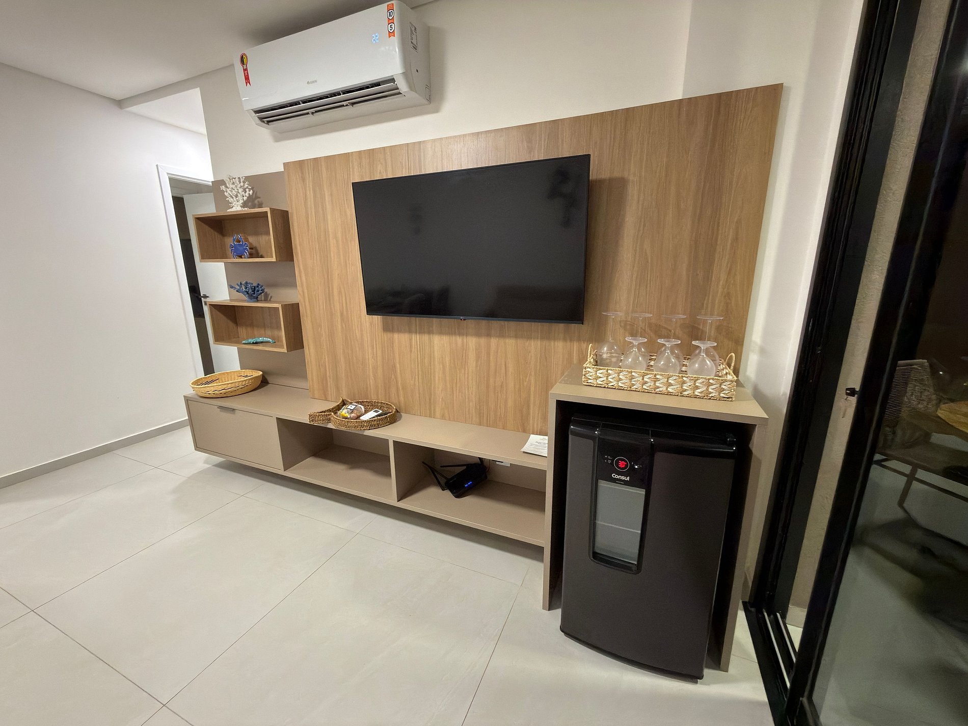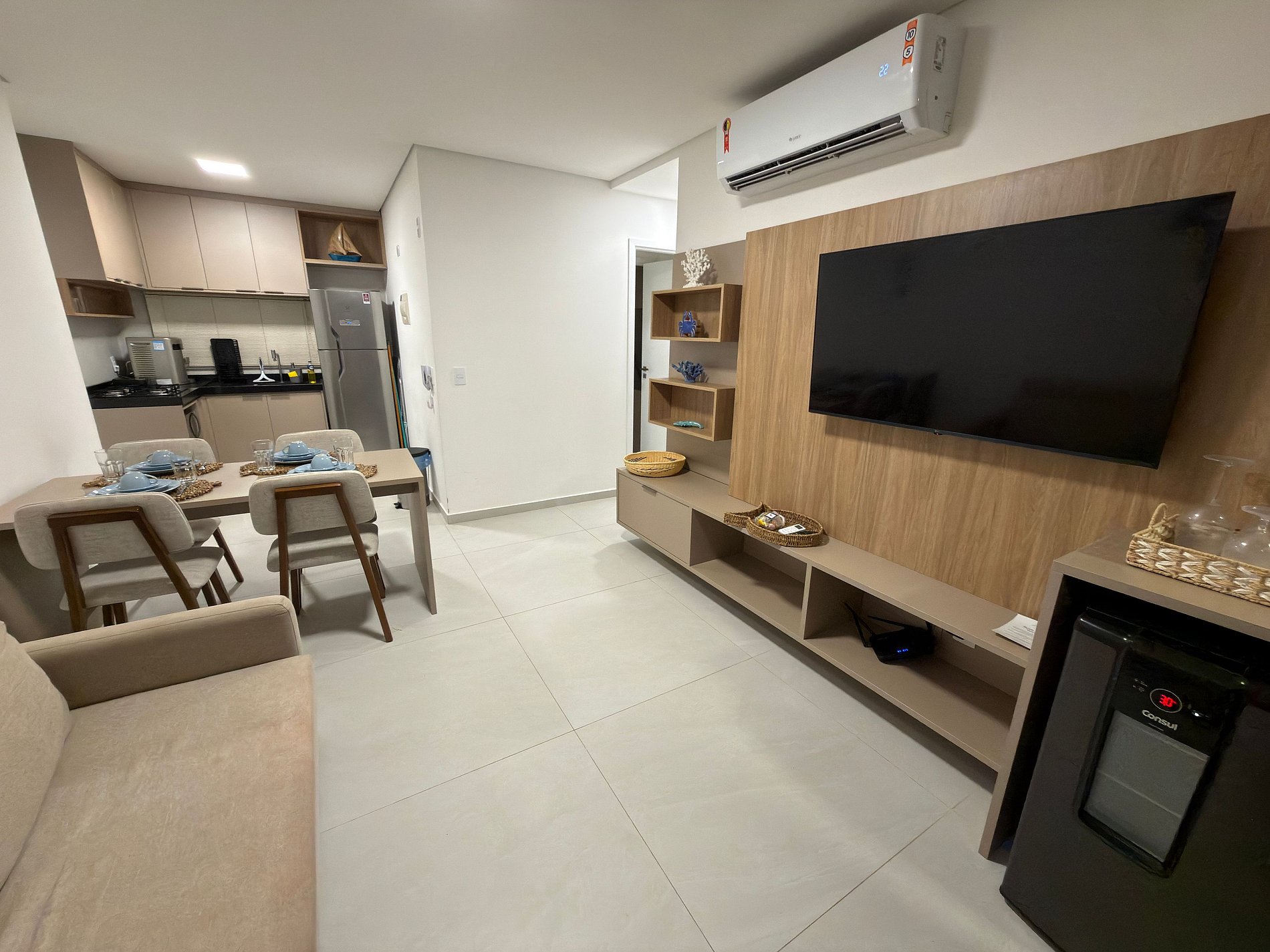 Sala de estar com sofá-cama, TV e ar-condicionado;