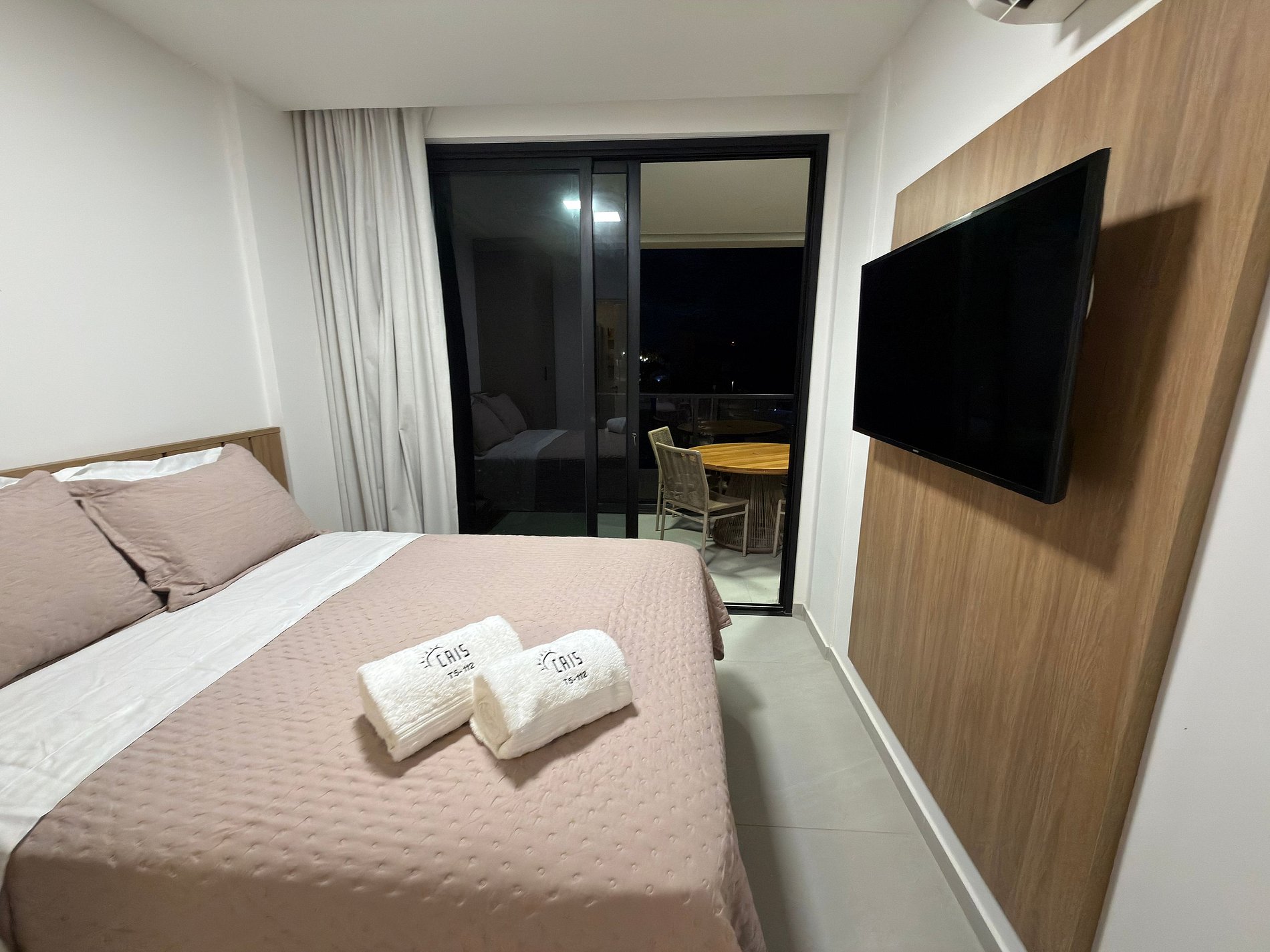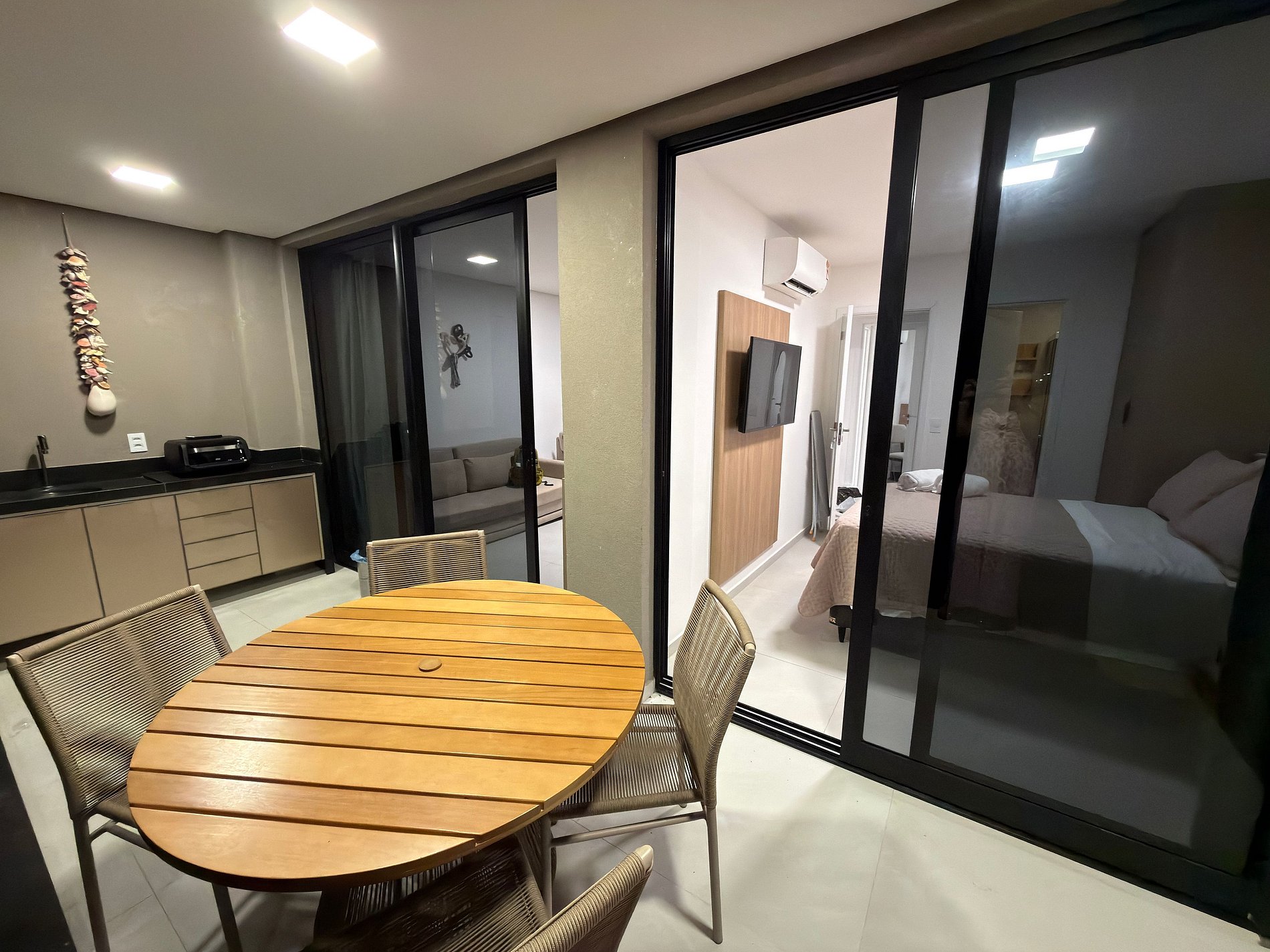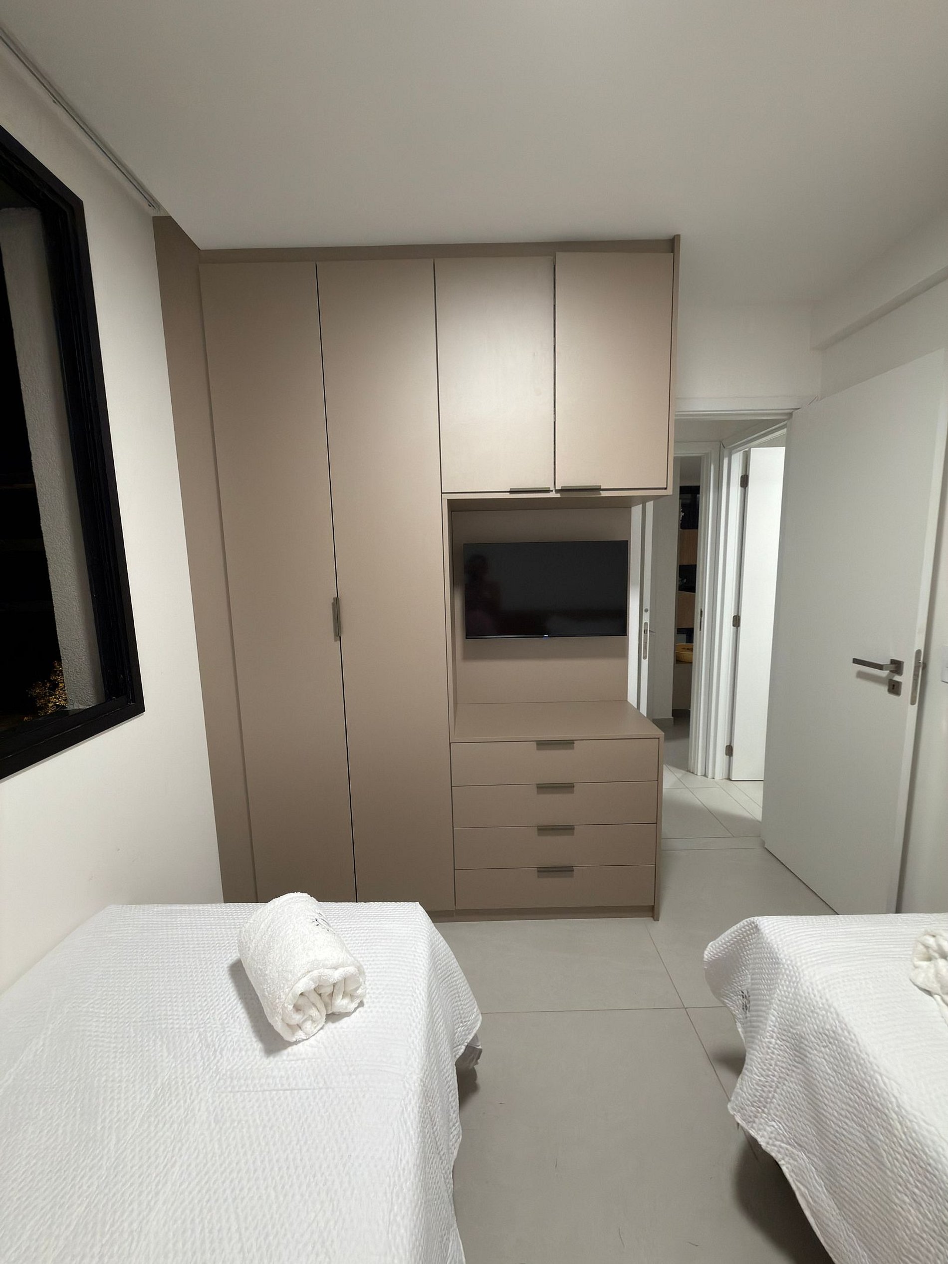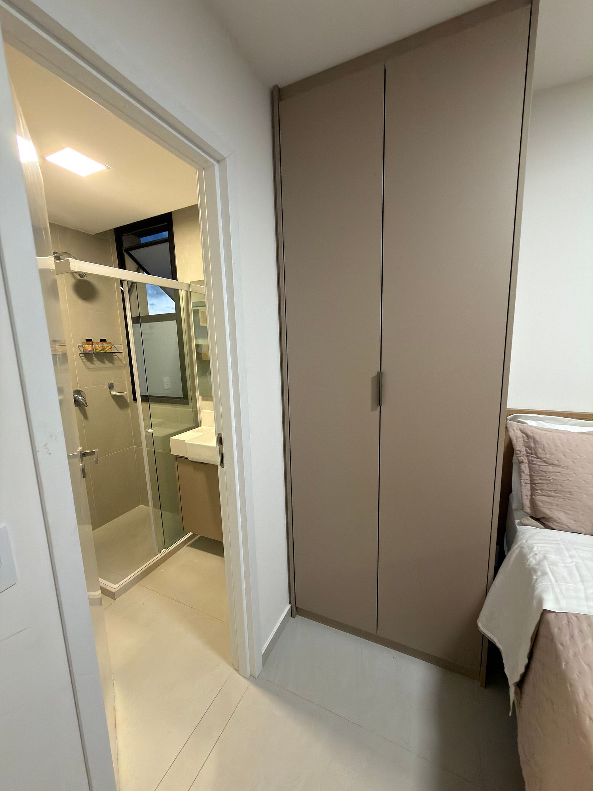 2 quartos aconchegantes (sendo um suíte e outro com banheiro ao lado, que pode funcionar como banheiro social ou ser integrado, tornando-se uma segunda suíte). Ambos com TV, ar-condicionado e guarda-roupa;