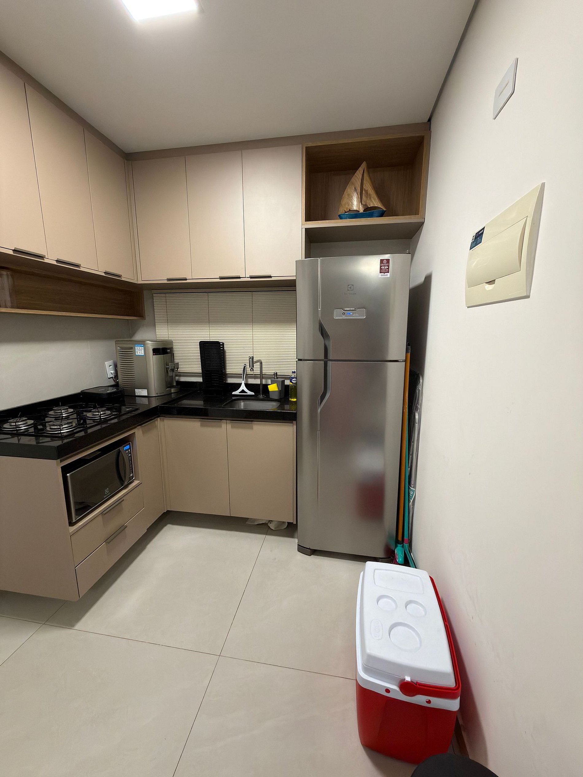 Cozinha completa: geladeira, micro-ondas, cafeteira, sanduicheira e utensílios;