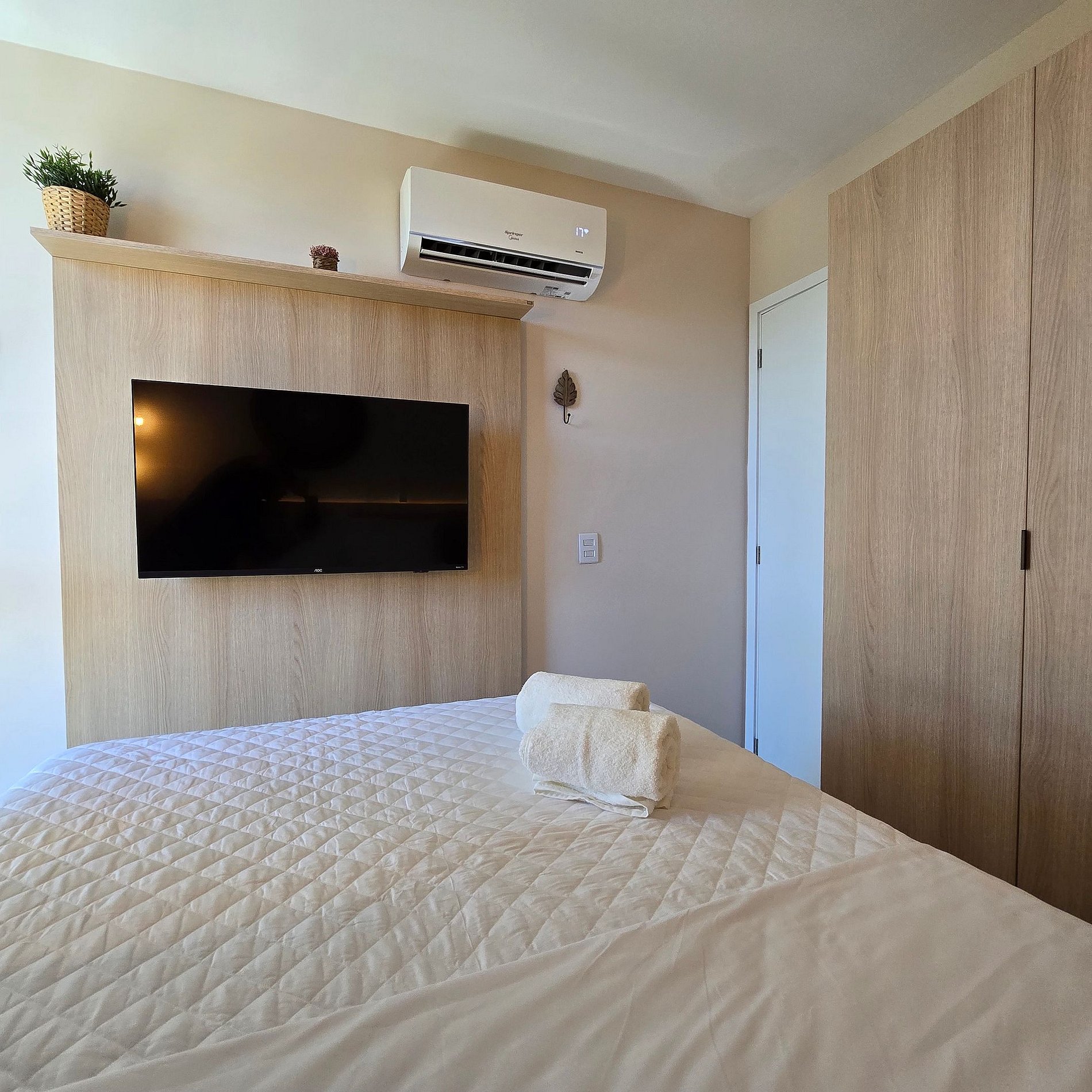 Quarto com cama de casal, guarda-roupa, TV e ar-condicionado;