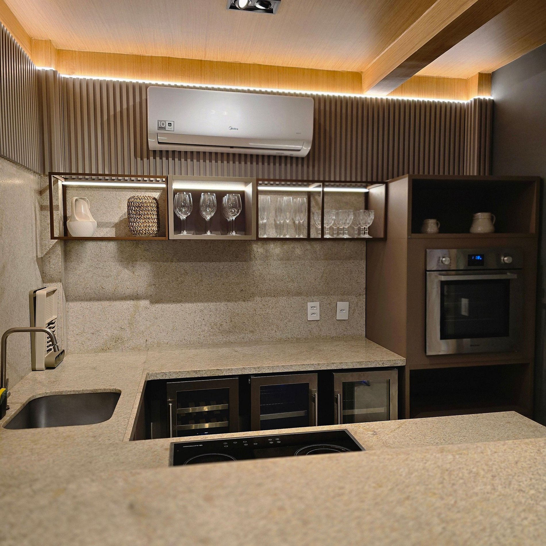 Varanda gourmet com churrasqueira elétrica indoor.